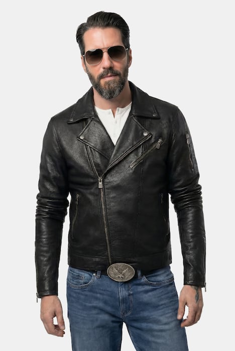 Lammnappa-Lederjacke - die beste for real men only! Original Biker-Lederjacke aus ausgesuchtem Lammnappa, soft und strapazierfähig. Mit JP1880-Knöpfen am Kragen, Metallzipper. 2 Zipptaschen.. Ärmelabschluss mit Zipper. Komplettfutter mit 2 Taschen. Die getestete Passform wird Sie auch in großen Größen überzeugen. JP1880 - for real men only!